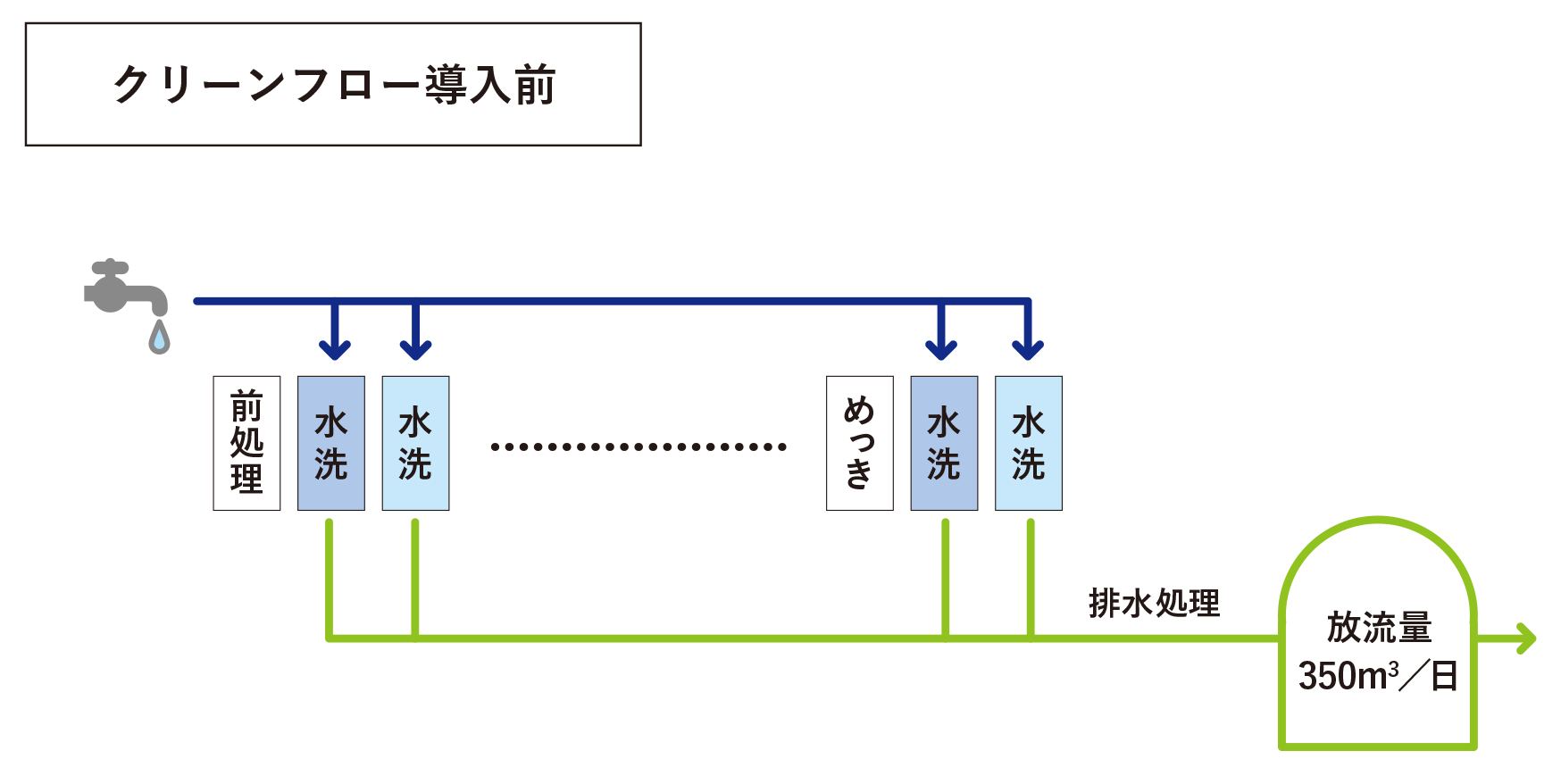 放流水量の上限が定められてしまったため、めっき水洗排水のリサイクル率を90%以上達成しないと、製造ラインで必要な水量の確保ができなくなる可能性がありました。